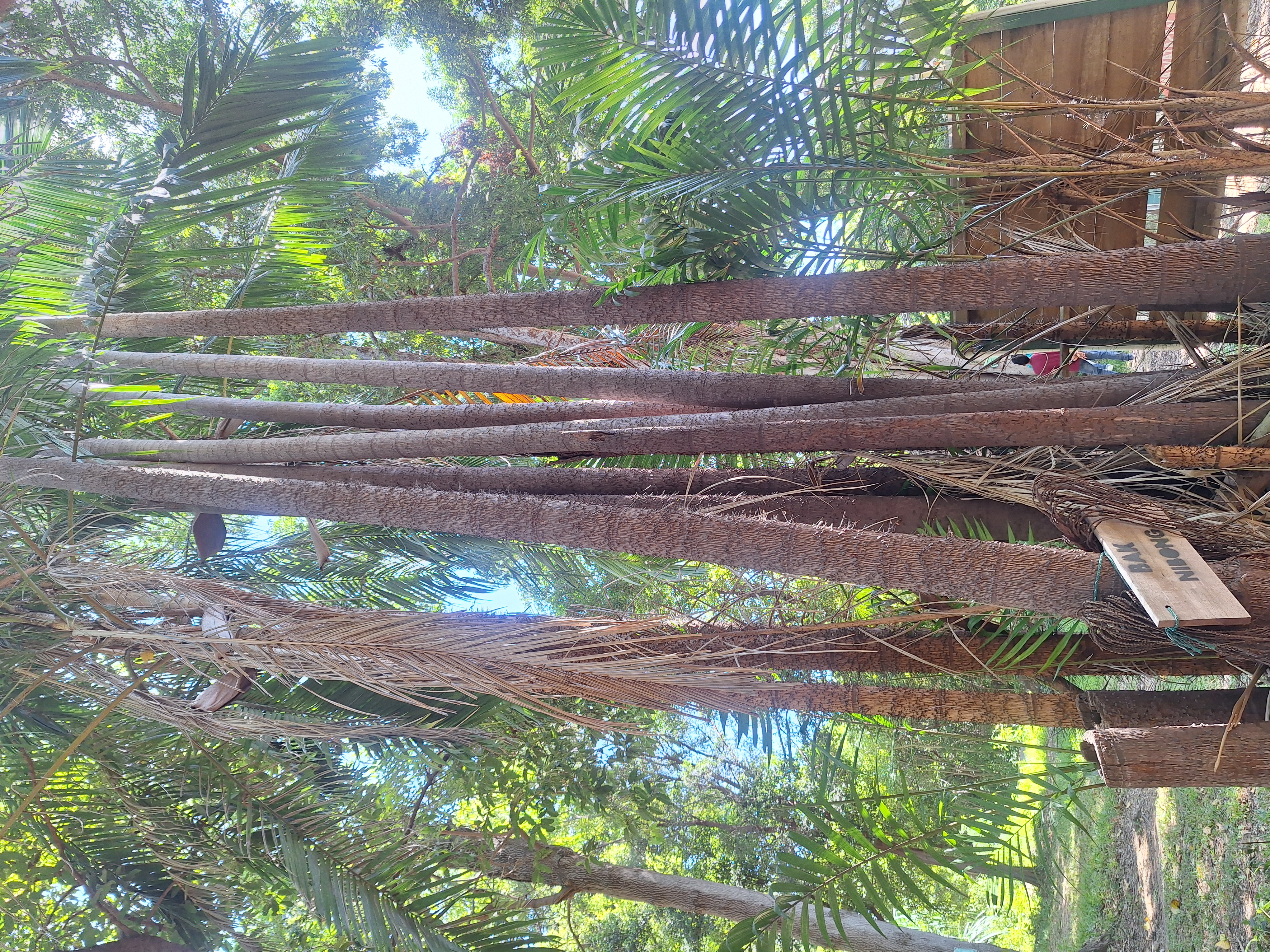 Palem ini dapat tumbuh hingga 30 meter menjulang tinggi dengan sosok yang ramping, beruas-ruas, dan elegan. Batangnya berdiameter sekitar 15 cm, dikelilingi oleh bekas pelepah daun tua serta dipenuhi duri-duri hitam ramping sepanjang 5-10 cm. Pada bagian mahkota, batang tampak semakin mencolok karena dihiasi oleh deretan duri tajam yang memperkuat kesan gagah dan eksotis.